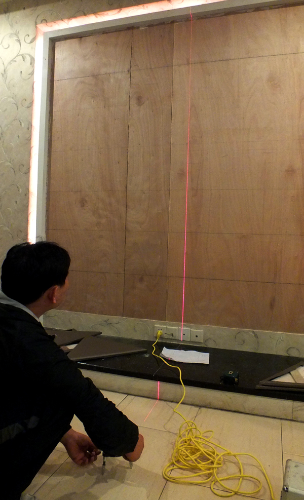 3、吊直、套方、找規(guī)矩、彈線:根據(jù)設(shè)計(jì)圖紙要求,把該房間需要軟包墻面的裝飾尺寸、造型等通過吊直、套方、找規(guī)矩、彈線等工序,把實(shí)際設(shè)計(jì)的尺寸與造型落實(shí)到墻面上。
